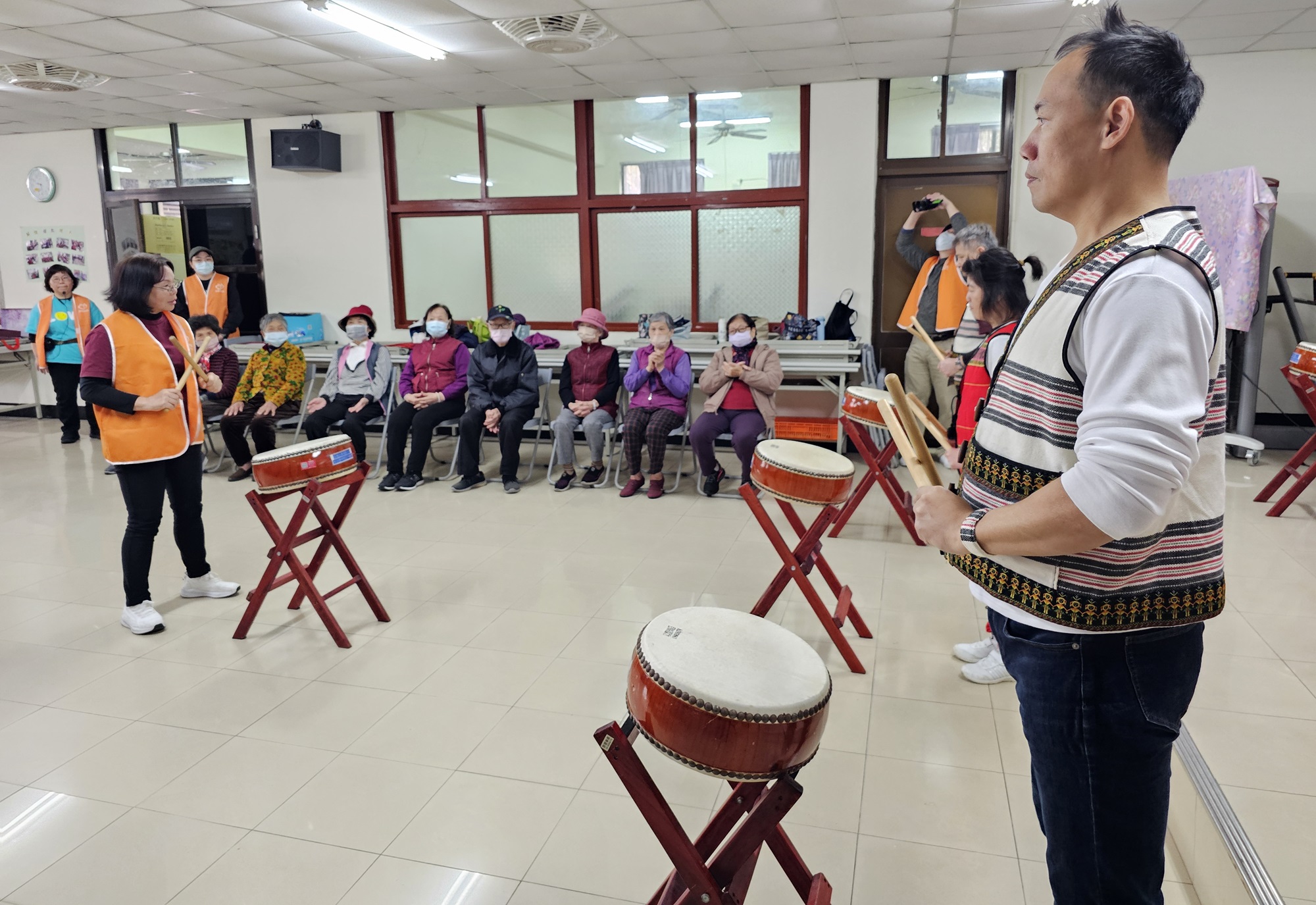 活動最後安排互動音樂時段,參與者在帶領下使用簡易樂器,隨著音樂節奏進行律動與伸展,並結合多語言歌曲,增添活動的多元性與趣味性。整體氛圍輕鬆自然,讓每位參與者都能自在融入其中,享受音樂所帶來的愉悅體驗。